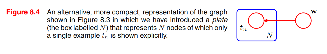 하지만, $t_{1}, \ldots, t_{N}$과 같은 여러 개의 노드를 그리려면, 더 복잡한(변수들이 더 많은) 모델을 다룰 때 불편할 것이다. 따라서 이런 여러 노드들을 더 간결하게 표현하기 위해 하나의 대표 노드$t_n$을 그리고 이를 판(plate)이라 불리는 상자로 둘러쌀 것이다. 그리고 상자에는 $N$(이러한 node가 $N$개 존재한다는 의미)이라는 라벨을 붙인다. Figure 8.4 그래프 모델