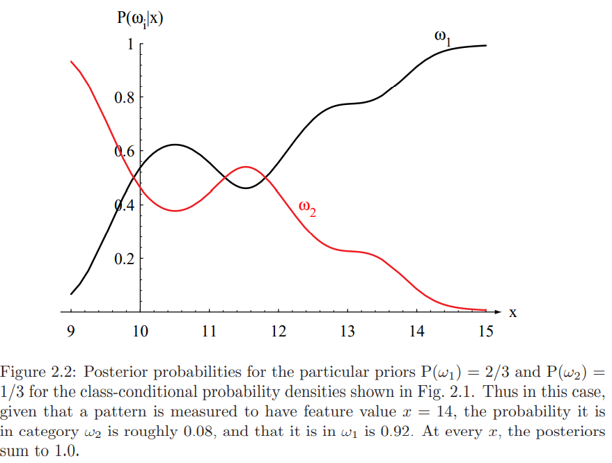 $$P(\text {error} \mid x)=\min \left[P\left(\omega_{1} \mid x\right), P\left(\omega_{2} \mid x\right)\right]$$