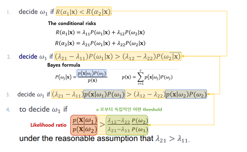 - $\lambda_{ij} = \lambda(\alpha_i | w_j)$ : the loss incurred for deciding $w_i$ when the true state of nature is $w_j$. (의미 : state of nature가 $w_j$일 때, $w_i$라고 판정하는 데 따르는 손실)