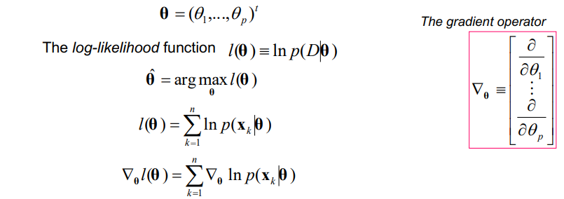 - $\widehat{\boldsymbol{\theta}}$ : the maximum-likelihood estimate of $\boldsymbol{\theta}$ is the value that maximizes $p(D|\boldsymbol{\theta})$