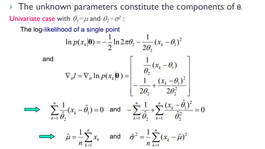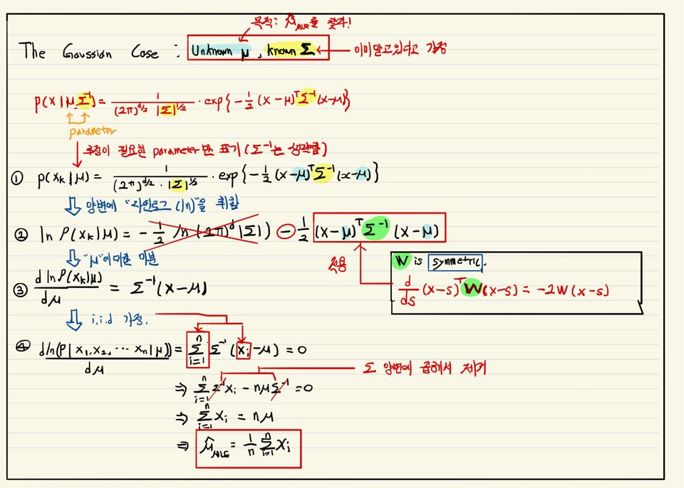 예를 들면, $\boldsymbol{\theta}_j$가 $\boldsymbol{\mu}$ (vector), 와 $\boldsymbol{\sum_j}$의 요소들로 구성되는 $p(\mathbf{x}|\omega_j) \sim N(\boldsymbol{\mu_j}, \boldsymbol{\sum_j})$를 가질 수 있다.