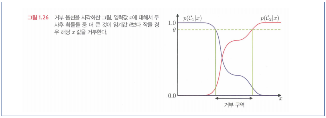 $\theta$(threshold)를 설정해서 사후 확률 $p(C_k|\mathbf{x})$들 중에서 가장 큰 값이 $\theta$보다 작거나 같은 경우 해당 입력값 $\mathbf{x}$를 거부하는 방식으로 이를 실행할 수 있음