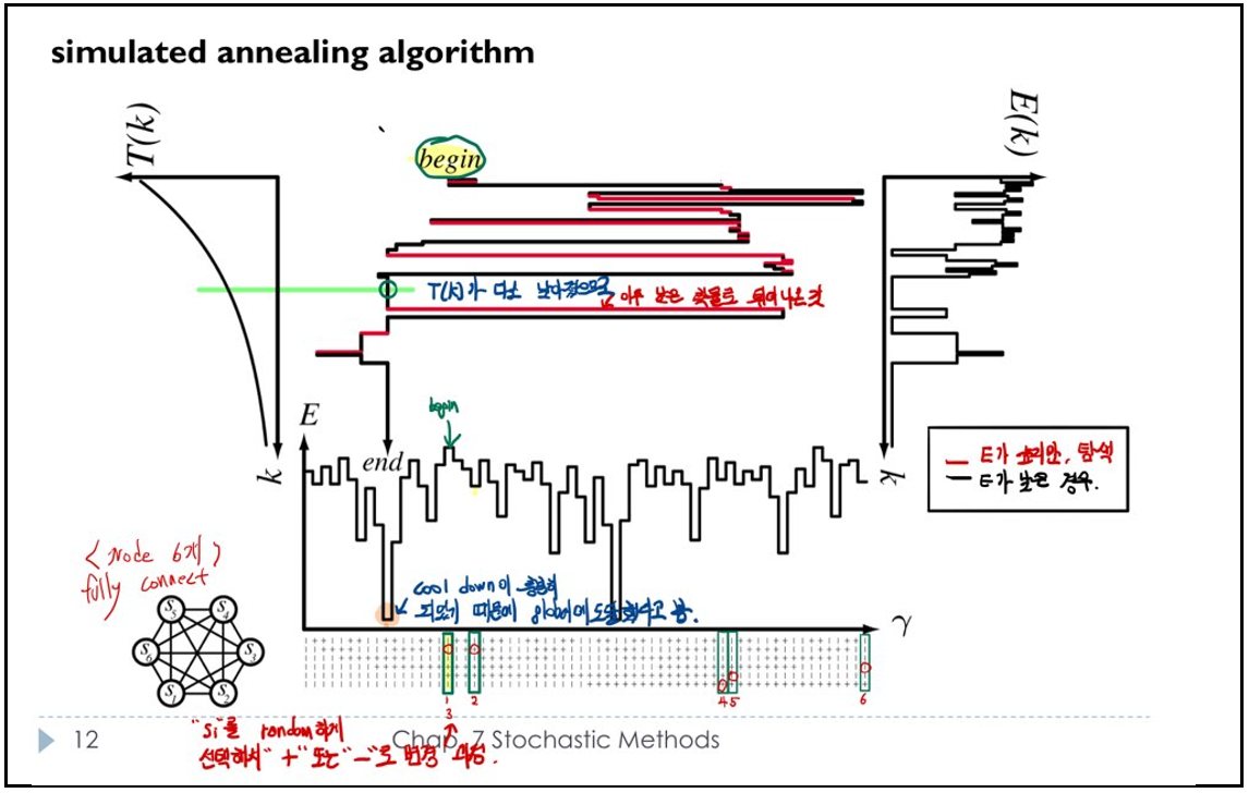 5, 6번째 의미는 에너지 측면에서 덜 유리한 상태를 가끔식 수용하는 것은 anneling algorithm의 핵심 요소임, 단순한 경사 강하와 탐욕스런 방식에 비해 탁월하다고 한다. (즉, 시스템이 원치 않는 local 에너지 상태에 빠진 경우, 뛰쳐 나오는 것을 가능하게 함)