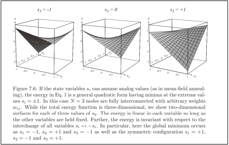 위 방법을 사용하면 아래 그림가 같이 에너지 $E$의 편미분은 각 변수에서 선형적이다. 따라서 어떤 축에든 평행한 모든 "단면(cut)"에는 local minima가 없다. 특히, 최적화 문제에서 요구하듯이, 모든 $i$에 대해 극 값 $s_i = \pm 1$에서 발생함을 알 수 있다.