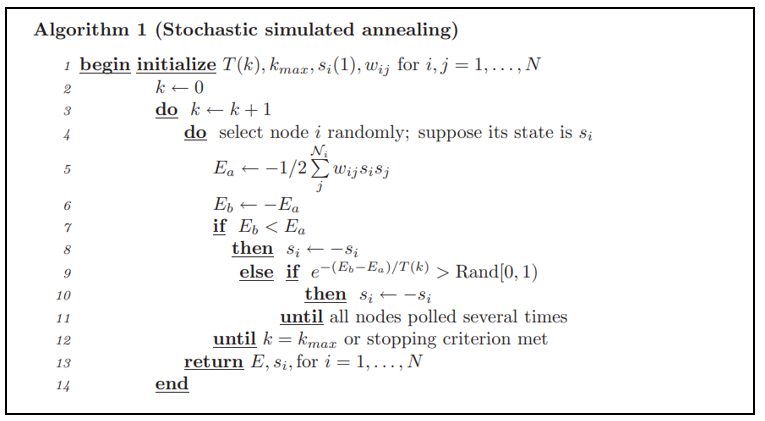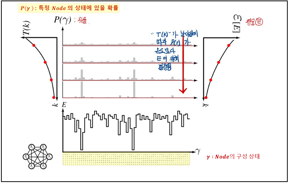 - network 전체에 걸쳐 random하게 된 node의 state(상태, {0 또는 1})로 설정, 초기에는 높은 온도 "$T(1)$"을 설정