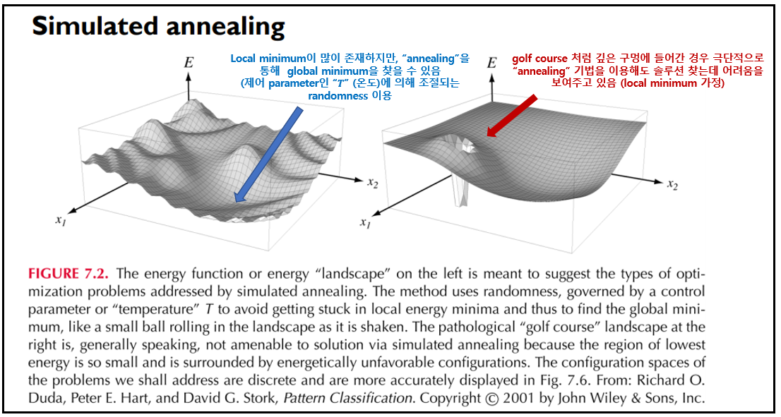 물리학에서 합금의 많은 자석 또는 원자 같은 시스템이 낮은 에너지 구성을 찾게 하는 방법은 "annealing"에 기반한다. 물리적 annealing시, 시스템은 가열되고, 그에 의해 각 요소(자석, magnet)에 randomness(랜덤성)을 부여한다. 결과로, 각 변수는 일시적으로 에너지 측면에서 불리한 값을 띠게 되고 전체 시스템은 높은 에너지를 갖는 구성들은 탐구한다. "annealing"은 시스템이 낮은 에너지 구성으로 이완될 수 있도록, 시스템의 온도를 점차적으로 낮추어, 궁긍적으로는 0을 향한 randomness가 없도록 진행한다. 이렇게 적당히 높은 온도에서 조차 전반적으로 에너지가 더 낮고, 그래서 global minimum을 포함할 가능성이 더 높은 구성 공간의 영역들을 시스템이 약간 선호하기 때문에 효과적이다. 온도가 더 낮아짐에 따라 시스템은 최적 구성을 찾을 확률을 증가시킨다. 이 방법은 아래 그림 오른쪽과 같이 golf course 지형 같은 경우도 있지만, 광범위한 에너지 함수에 성공적이다. 다행히, 우리가 고려할 학습에서의 문제들은 golf course 처럼 극단적인 케이스는 포함하지 않는다. (교재 내용 일부)