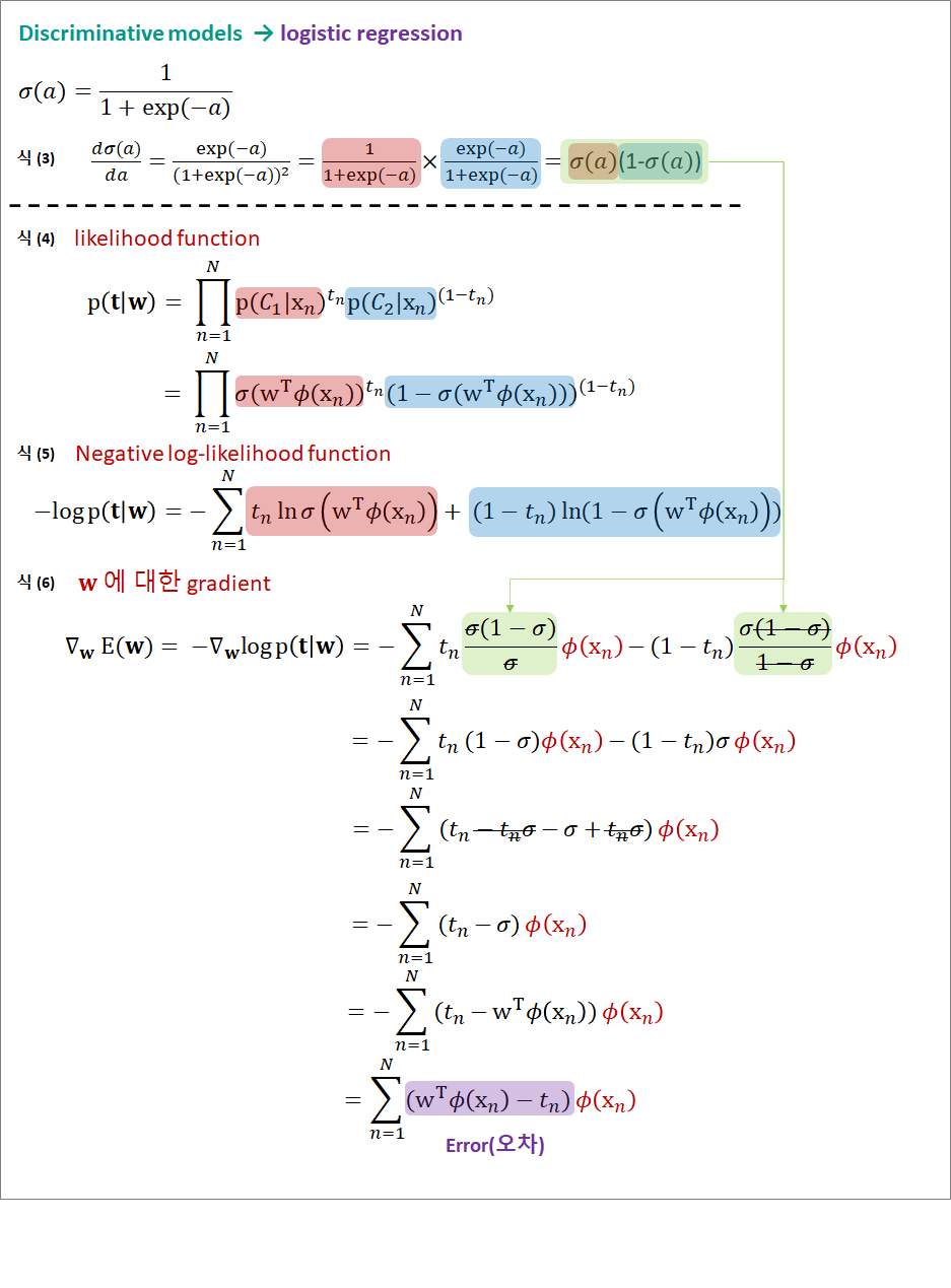 - Note that is is not possible to find the solution for logistic regression analytically (sigmoid function의 non-linear 한 form으로 해가 닫힌 형태가 아니므로, 행렬을 이용해 구할 수 없음, 그러나 convex function으로 global minima 존재하므로, iterative하게 구할 수 있음)