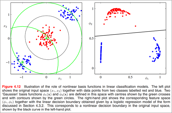 특징 공간 $\phi(x)$가 항상 linear하게 분리되는 것은 아니지만, 편의상 고정된 기저 함수를 명시적으로 사용한다고 한다.