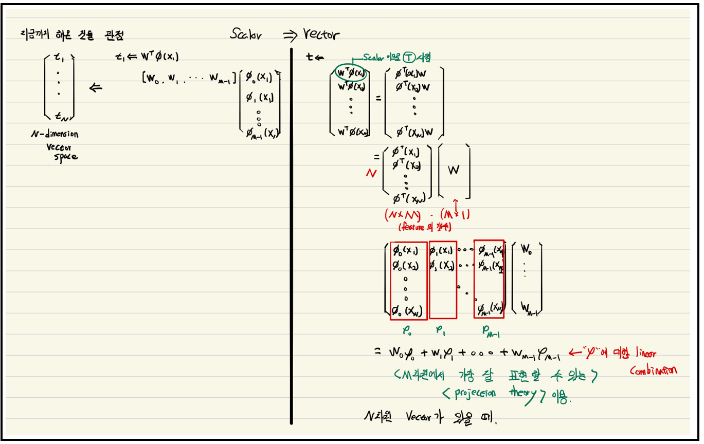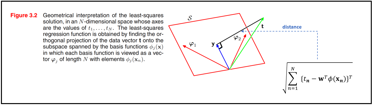 $\mathbf{t} = (t_1, ... , t_N)^T$을 축으로 가지는 $N$ 차원의 공간을 생각해보자. 각각의 basis function (기저함수) $\phi_j(\mathbf{x}_n)$들을 $N$개의 데이터 포인트들에 대해 계산한 값 역시 같은 공간상의 벡터로 표현 가능하다.