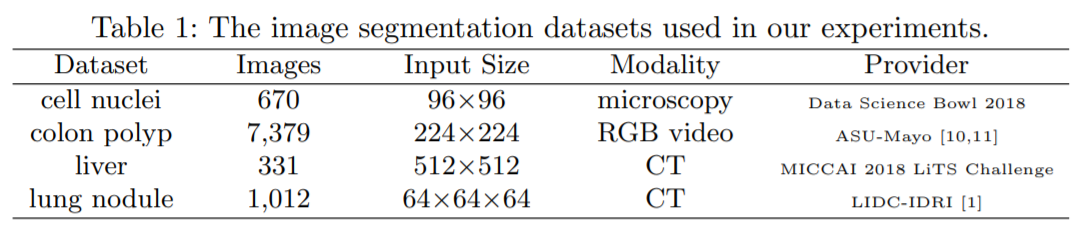 - We evaluated U-Net++ using four medical imaging datasets covering lung nodule segmentation, colon polyp segmentation, cell nuclei segmentation, and liver segmentation.