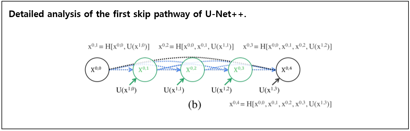 [Figure7]에서 $\bf{X}^{0,0}$ 노드 (purple circle) 와 $\bf{X}^{1,3}$ 노드 (purple circle) 사이에는 skip pathway (same dense block, blue box)가 있다. skip pathway안에는 3개의 convolution Layer($\bf{X}^{1,0}$, $\bf{X}^{1,1}$, $\bf{X}^{1,2}$)가 존재한다. 이 각각의 convolution layer는 같은 level에 존재하는 dense block의 이전 시점의 convolution layer의 출력과 아래 존재하는(level이 다른) dense block의 up-sampling된 출력과 concat되어진 layer다. (e.g. $\bf{X}^{1,2}$의 layer는 동일한 dense block에 있는 앞의 layer인 $\bf{X}^{1,1}$과 하위 level의 dense block에 존재하는 $\bf{X}^{2,1}$와 concat된 결과 연결하는 layer를 의미함)