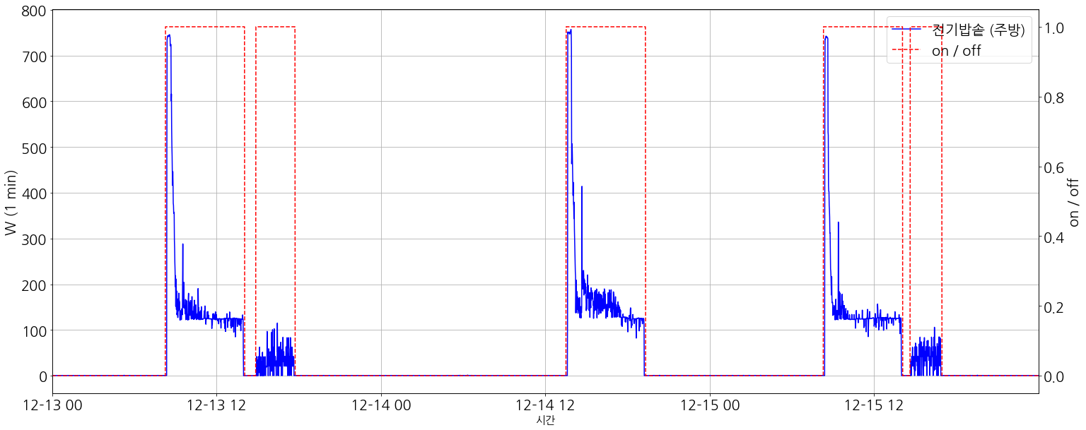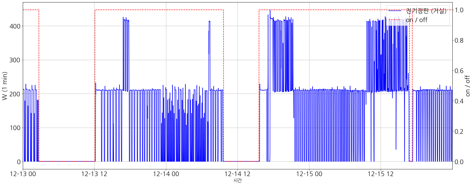 센서 데이터를 처리하는데 있어서 [Figure 1]에서 파랑 line으로 수집되고 있었다. 세탁기가 작동하는 구간에 대해 label = 1로 설정을 했지만, 단순히 측정된 Power (W)를 활용하여, threshold(e.g. 1~2)로 판단했을 때, labeling 결과가 나오지 못하고 있었다. (원인, 세탁기라는 가전제품의 특성으로 물이 들어오고 나가는 경우에는 전력소모가 없다는 점, Fail로 표기된 부분)