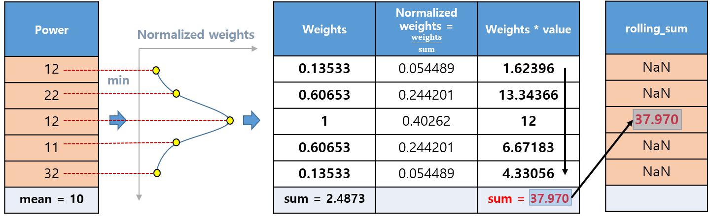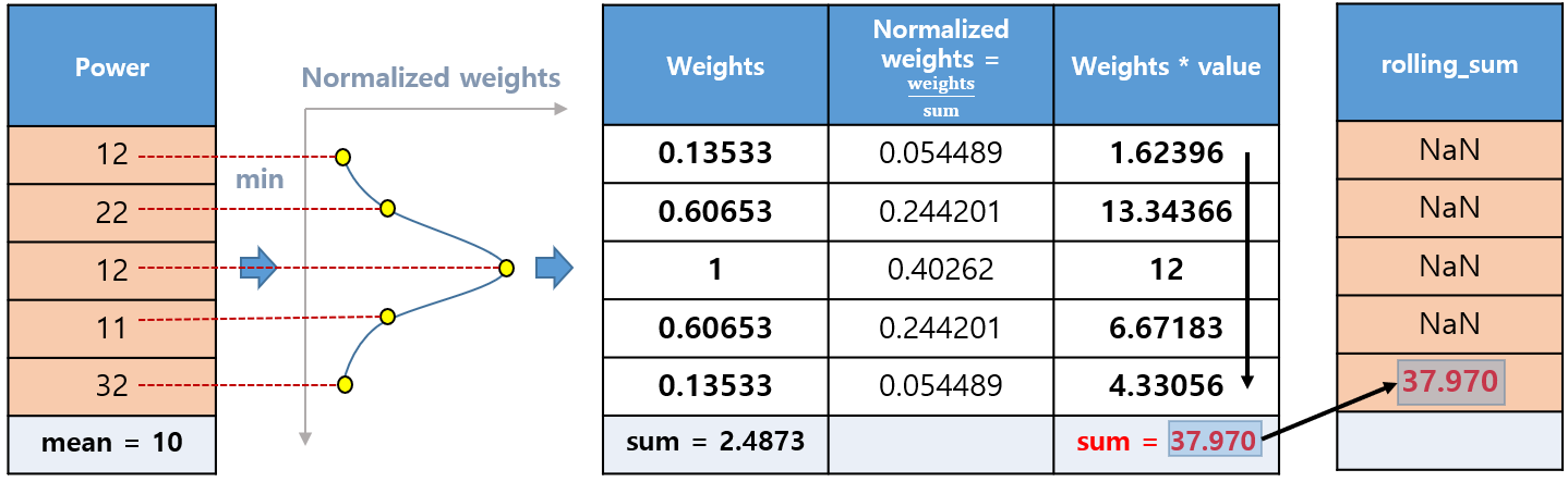 - df.rolling(window=5, center=True, win_type='gaussian').sum(std=1)