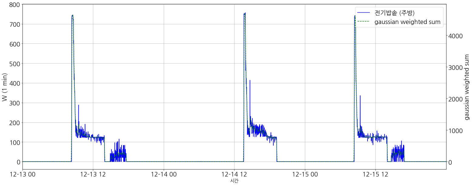 moving average, filter 등 여러 방법을 고민하던중. 결국 gaussian window (점선)을 이용하면 [Figure 2]와 같이 원하던 label을 할 수 있었으며, 이에 대한 원리 및 방법을 간단하게 살펴보고자 한다.