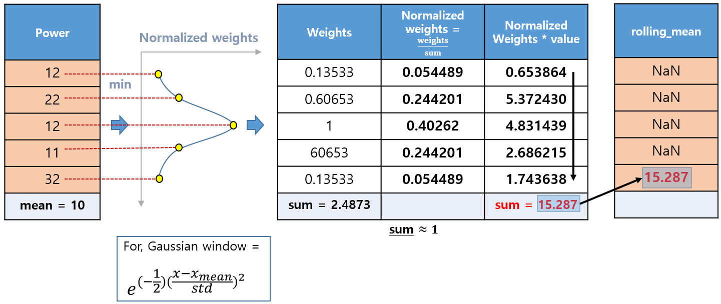 - df.rolling(window=5, center=False, win_type='gaussian').mean(std=1)