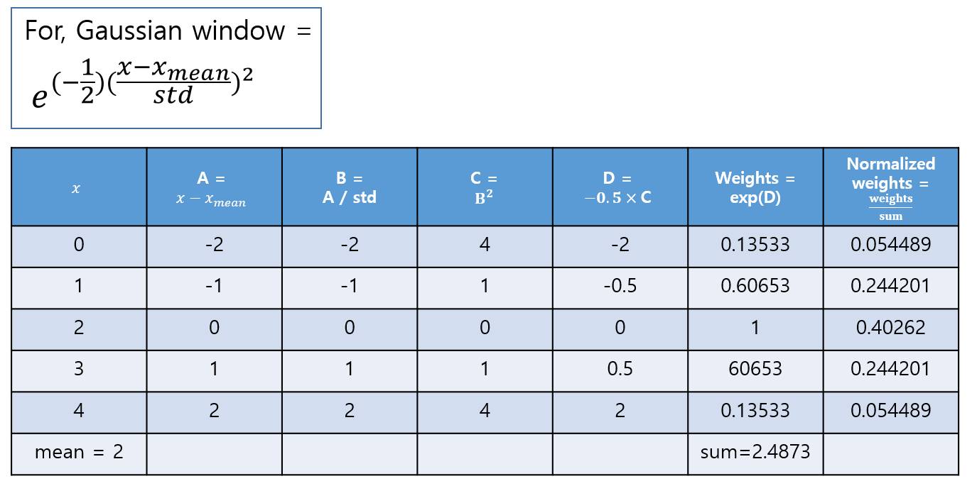지금까지 gaussian weight를 활용하여 기존 값(value)를 weight가 적용된 새로운 값(new value)를 만드는 절차를 살펴봤다. 하지만, weight가 어떻게 얻어지는지 궁금하다면 Appendix를 참고하자.