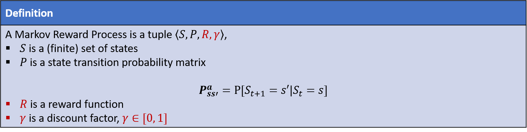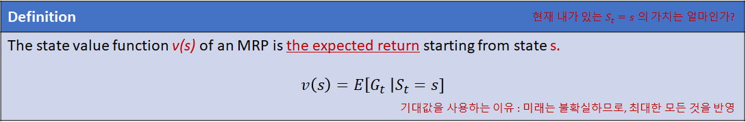 MRPs(Markov reward Process)는 Markov Process에 value(Reward, 보상) 및 discount factor가 추가된 것이다.