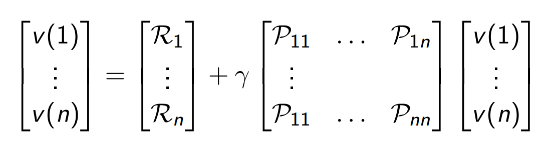 - The Bellman equation can be expressed concisely using matrices where $v$ is a column vector with one entry per state