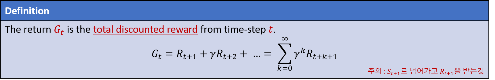 종종 다른 교재 및 참고서에서는 $R_t$로 표기되기도 하는데, 여기서는 $R_{t+1}$로 약속한다. (의미는 같음)
