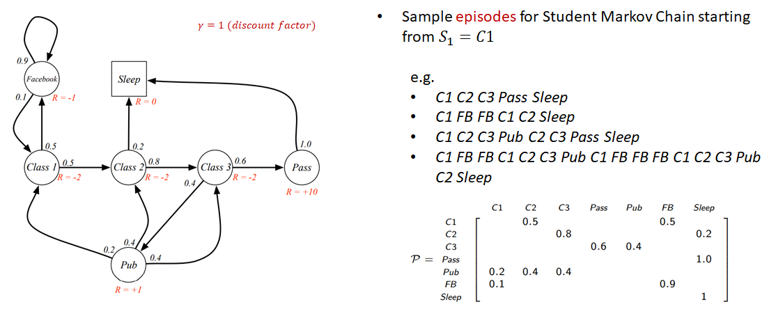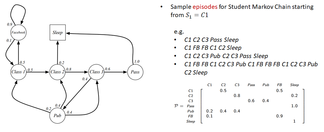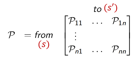 - State transition matrix $P$ defines transition probabilities from all states $s$ to all successor states $s'$, where each row of the matrix sums to 1.