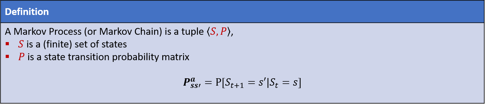 - A Markov process is a memoryless random process, i.e. a sequence of random states $S_1, S_2, ... $ with the Markov property.