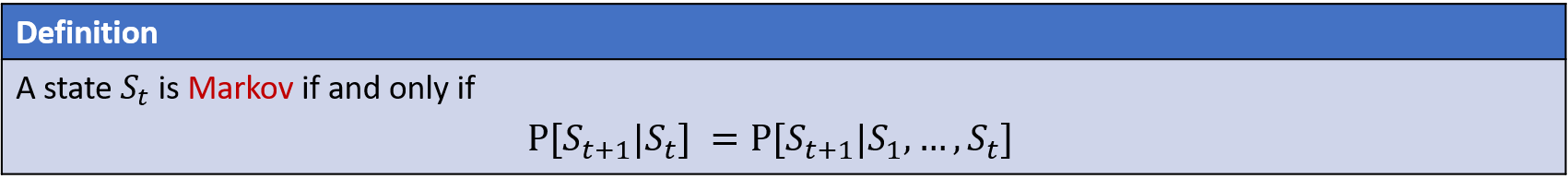 어떤 $t$ 시점에서의 상태인 $S_t$가 Markov 라고 하면, 동치는 다음과 같다. $S_t$(현재 상태)가 주어졌을때, $S_{t+1}$(미래 상태)의 확률은 $S_1, ... , S_{t+1}$ (과거 상태 set)이 주어졌을때, $S_{t+1}$의 확률이 같다.