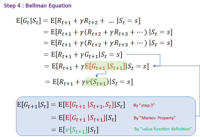 강조 : value function를 Bellman Equation로 만든 위 식의 전개과정 및 암기 필수.
