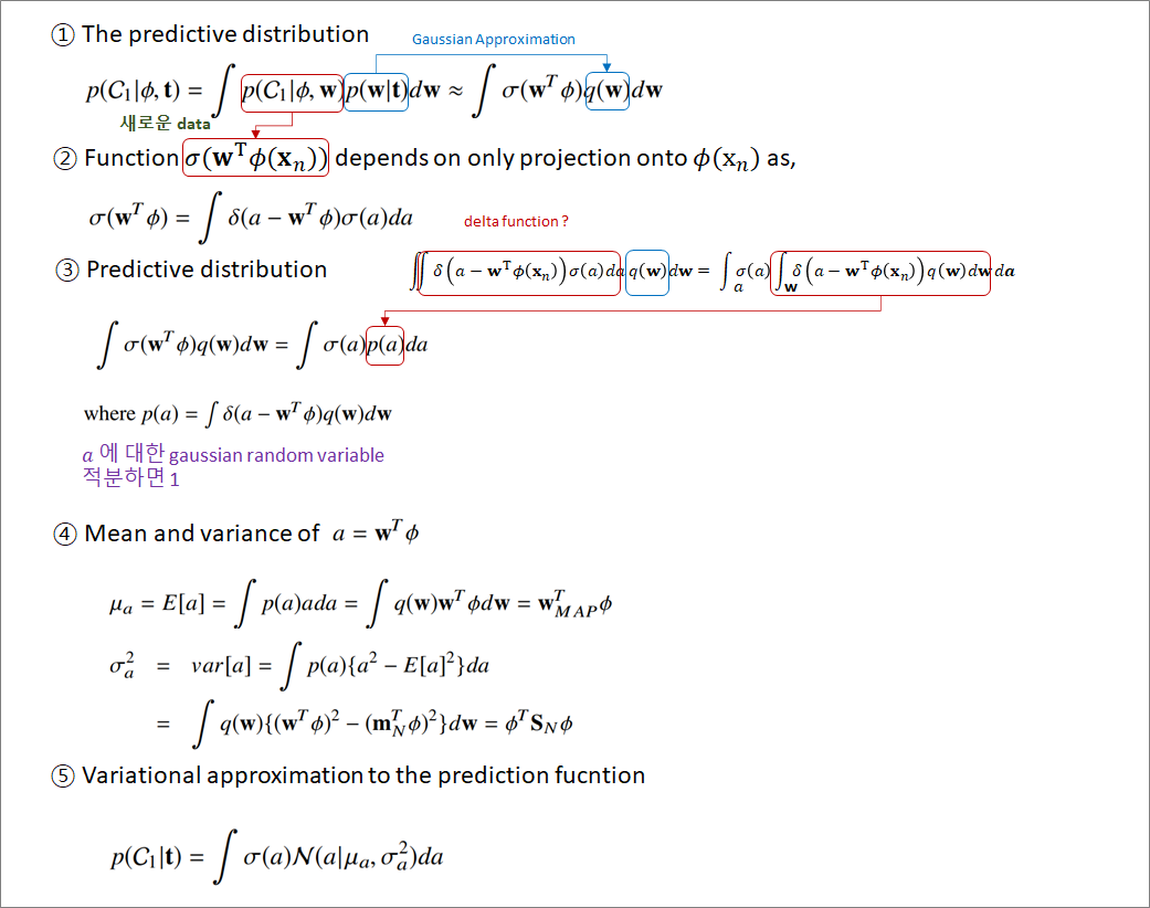 사후 분포의 가우시안 근사치를 구하였으니 이제는 실제로 예측을 시행하기 위해서 이 분포에 대해 주변화를 시행하는 것만 남았다.