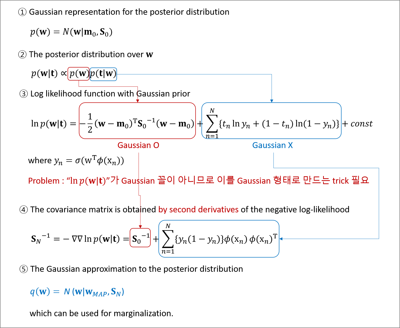 로지스틱 회귀의 베이지안적 방법론에 대해 살펴보도록 하자. 로지스틱 회귀의 정확한 베이지안적 추론은 다루기가 아주 어렵다 사후 분포를 계산하기 위해서는 사전 분포와 가능도 함수를 곱한 값을 정규화해야 하는데, 가능도 함수 그 자체가 각 데이터 포인트마다 로지스틱 시그모이드 함수를 모두 곱한 값에 해당하기 때문이다. 예측 분포를 계산하는 것 역시 비슷한 이유로 다루기가 매우 어렵다 따라서 여기서는 베이지안 로지스틱 회귀 문제에 라플라스 근사 적용 필요