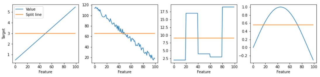 요구되는 분할(required splits)에 대해 더 잘 이해하기 위해 "Feature vs Target" graph를 참고하였다. 각각의 feature 는 x축, target은 y축이며, 또한 split line을 사용하여 낮음(low, 0)과 높음(high, 5)으로 구분된 target(value)값을 구분(예측)하고자 한다.