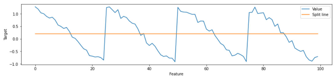 feature가 위 그림에서 보이고 있는 반복적인 신호(패턴)을 캡처하기 위해 더 많은 split이 필요하므로 더 깊은 tree가 필요하게 된다. 그러나 너무 많은 leaf 및 depth를 가진 tree는 overfitting에 위험이 더 높다는 것을 누구나 알고 있을 것이다. (즉, 모델이 더 depth를 가진다고 해서 test set에서는 정확한 예측을 할 수 없다.)