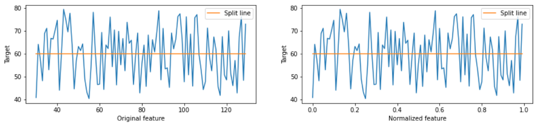 왼쪽 그림과 오른쪽 그림의 차이는 X축의 scale 차이다. model은 낮은 target 값과 높은 target값을 분리하기 위해 정규화 전과 정확히 동일한 분할이 필요하다는것을 알 수 있다.