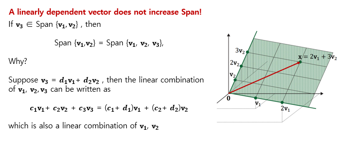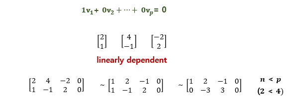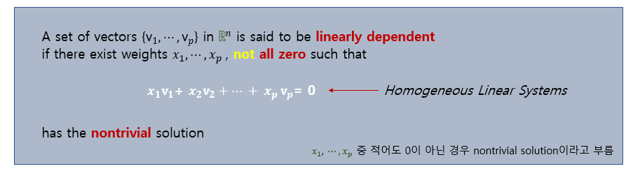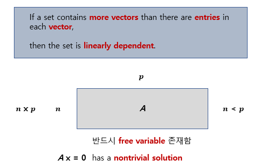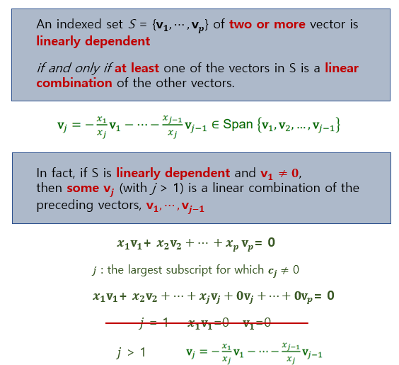 그때의 조건을 가지고 아래와 같이 정리하면 선형 종속 셋에 대한 특성을 알 수 있다.