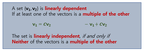 두 개의 vector로 이루어진 vector set이 서로 종속이면 하나의 vector는 다른 하나의 vector에 상수배로 표현할 수 있다.