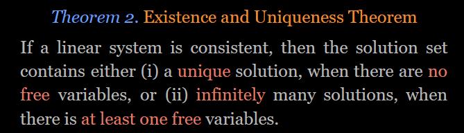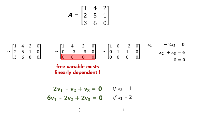 free variable이 존재하는 경우 가능한 solution이 매우 많아지고, 선형 종속임을 알 수 있다.