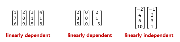 이번 절에서 배운 개념을 이용하여 아래 Matrix의 Column들을 가지고 선형 종속 또는 독립을 판단해보자.