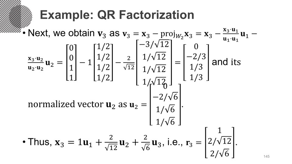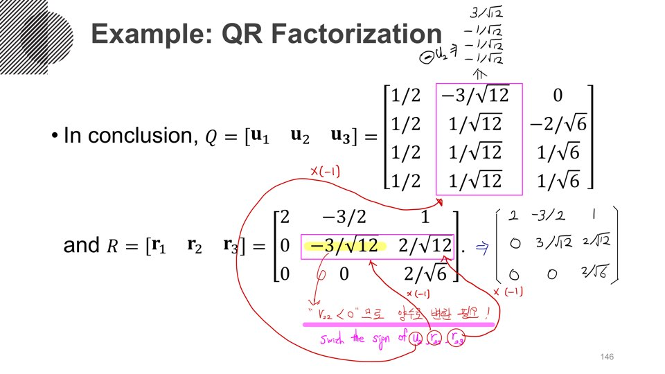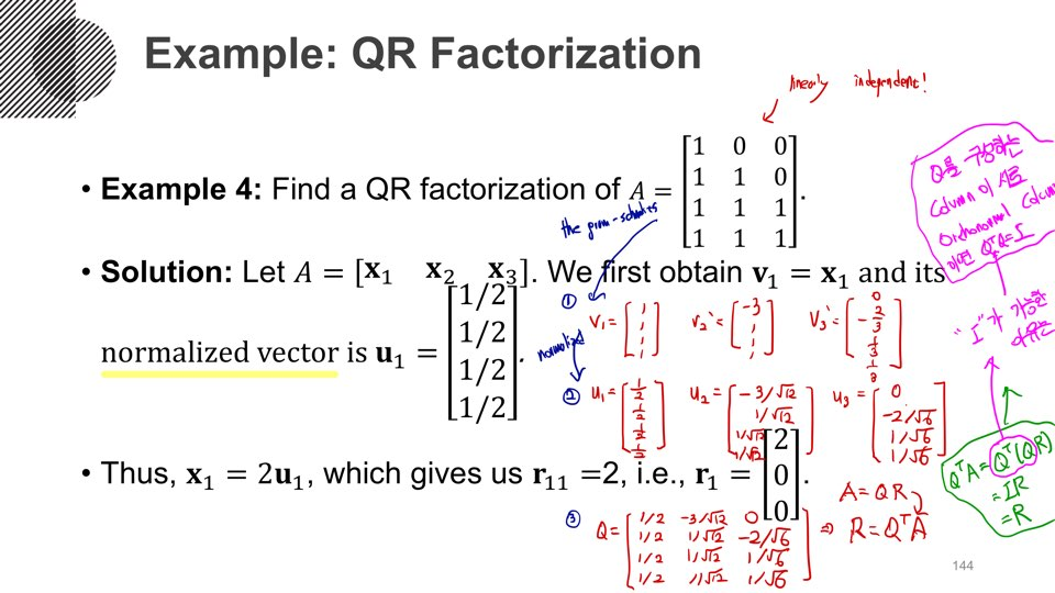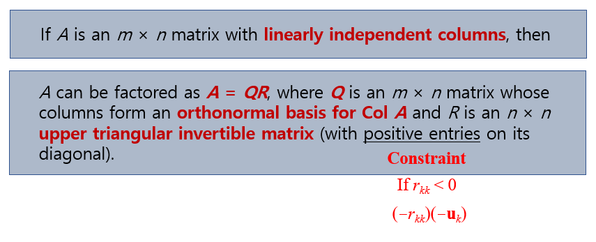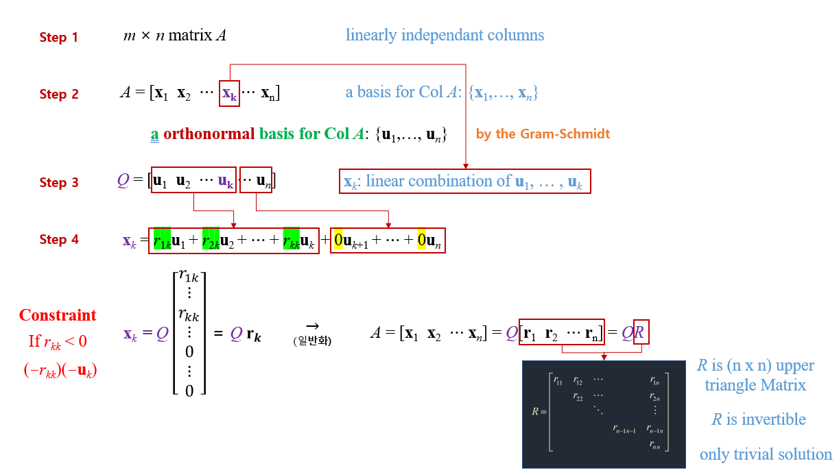QR Factorization of Matrices 는 선형 독립인 Column들로 구성된 Matrix A (m x n)를 Gram-Schmidt 도구를 활용하여 다음 Step에 Q Matrix와 R Matrix로 분해된다.