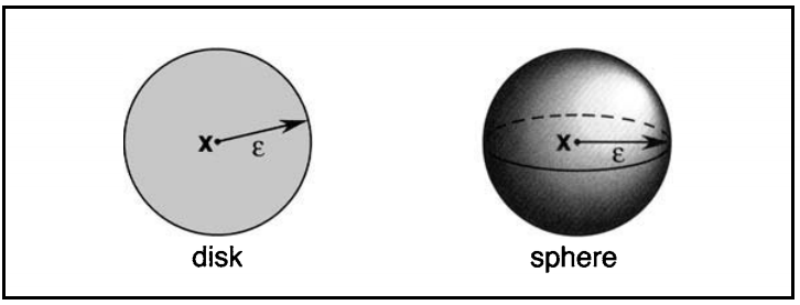 2차원 및 3차원에서의 point x에서의 입실론거리 내의 neighborhood는 각각 아래의 공간(회색 부분)을 나태낸다. 그리고 공간내에 존재하는 point를 interior point라고 한다.