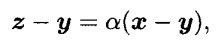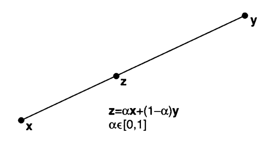 n차원에 point x 와 point y 가 있다고 하자. point를 vector로 표현 가능. [Figure 4.1]을 보면 x 와 y 점이 찍혀있을 때, 두 점을 연결한 것을 확인할 수 있는데, 이때, x 와 y 사이를 연결하는 선을 Line segment라고 한다. 그 위에 z를 올려보면 z는 x와 y에 대해 아래와 같은 관계식를 가진다.