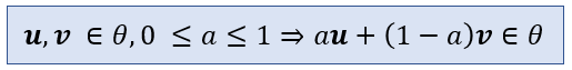 즉, 어떤 집합(set, θ)이 주어져 있다고 하자. 이 집합의 원소인 두 점 (u)과 (v)를 잇는 선분이 이 집합에 다시 포함될 때, 우리는 이 집합을 convex set이라고 부른다. 다시 말하면 집합 θ가 convex가 될 조건은 다음과 같다.